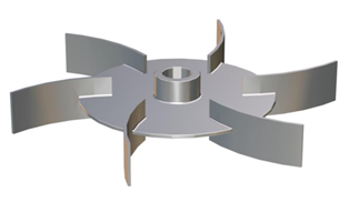 ②渦輪式攪拌器:由在水平圓盤上安裝2~4片平直的或彎曲的葉片所構成。槳葉的外徑、寬度與高度的比例,一般為20:5:4,圓周速度一般為 3~8m/s。渦輪在旋轉時造成高度湍動的徑向流動,適用于氣體及不互溶液體的分散和液液相反應過程。被攪拌液體的粘度一般不超過25Pa·s。